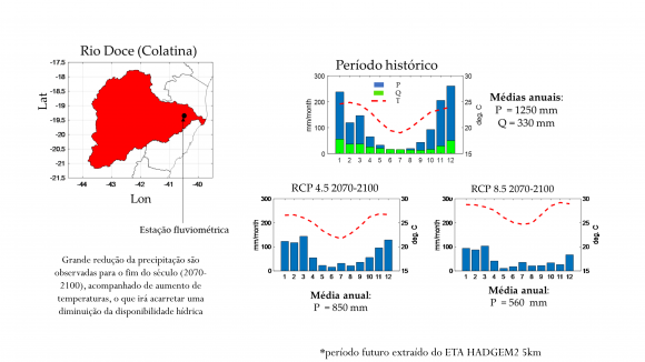 As figuras a seguir mostram as projeções do ciclo hidrológico projetadas para o fim do século para três bacias hidrográficas no estado do Espírito Santo. As bacias em destaque são a Bacia do Rio Doce, Bacia do Rio Itapemirim e Bacia do Rio São Mateus. Estas bacias foram escolhidas pois exemplificam os diferentes regimes hidrológicos observados no Espírito Santo, sendo o rio Itapemirim, localizado no Sul do estado, o mais úmido e o rio São Mateus, localizado no Norte do estado, o mais seco, além do Rio Doce, com comportamento intermediário. Podemos observar tal comportamento no painel superior, onde são exibidas as médias históricas (1980-2013) mensais de chuvas e vazões dos rios em milímetros por mês, além das temperaturas médias observadas.